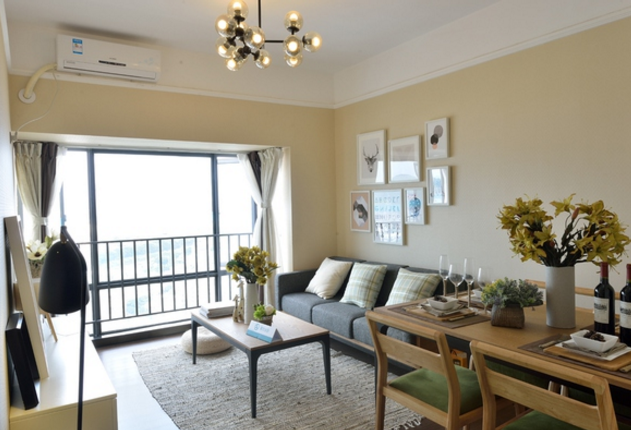 天然的原木色地板,與淺灰色地毯相搭配,帶一點(diǎn)棉麻質(zhì)感,特別顯沉穩(wěn)。整個空間墻面則以簡約的米黃色墻紙來打造,不規(guī)則搭配的小幅裝飾畫為整個墻面增添了裝飾性,整個北歐簡約感展現(xiàn)無遺。