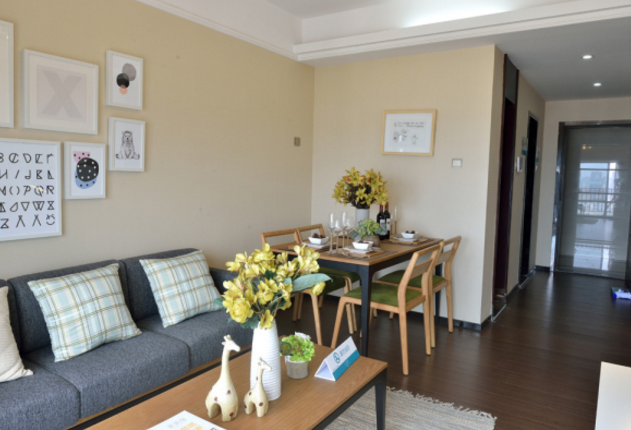 深灰色布藝沙發(fā)和原木色餐廳家具,在視覺上放大了空間,增強(qiáng)縱深感。配合隨處可見的鮮花綠植和時尚造型吊燈,溫馨時尚,整個空間充濃厚的自然氣息。